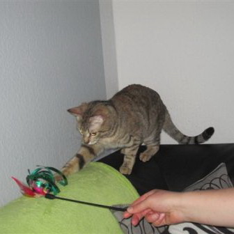 Also gingen die Verhandlungen mit meinem Mann los… (eigentlich war ich es, die es im Haus zu ruhig fand…) Nach einem Gespräch mit einer lieben Arbeitskollegin, die im respektiere-Team mitarbeitet, beschloss ich, mir die kleine, leicht körperlich behinderte Alia auf der Pflegestelle anzuschauen (die Begeisterung meines Mannes hielt sich allerding sehr in Grenzen). Da ich wusste das Alia an einer leichten Kleinhirn-Ataxie leidet, war ich mit nicht allzu großen Erwartungen zum verabredeten Termin gefahren, denn natürlich hat man Bedenken ein „krankes“ Tier zu übernehmen. Aber Diese Bedenken waren in einer Minute ausgeräumt. Als Alia mit ihrer Schwester in den Raum gestürmt -ich betone gestürmt- kam, war ich vollkommen hin und weg. Diese kleine, dünne, zierliche Maus hatte überhaupt keine Probleme mit ihren manchmal etwas wackeligen Hinterbeinen, im Gegenteil. Sie fegte wie der geölte Blitz auf das Sofa, auf den Kratzbaum und durch das Zimmer. Zudem strahlte sie eine derartige Neugier und Lebensfreude aus, der man sich unmöglich entziehen konnte. Und die Sympathie war offensichtlich nicht nur einseitig. In einem unbeobachteten Moment -ich kniete auf dem Boden- sprang Alia auf meinen Rücken und begann meine Haare zu putzen und zack – weg war mein Herz!