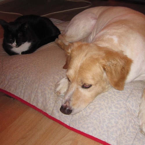 Ende letzten Jahres merkten wir, dass es dir nicht mehr gut ging. Deiner Stoffwechsel wollte nicht mehr so richtig, dein Fell wurde dünn, du warst schnell müde und fingst wieder an zu humpeln. Aber unsere Heilpraktikerin hat es erneut geschafft, dass du wieder fit wurdest und dir ein schönes Winterfell wuchs. Vor einigen Wochen haben wir dann Umfangvermehrungen am Hals und Bauch festgestellt, waren uns aber mit Tierarzt und Heilprakterin einig, dass wir dich aufgrund deines Alters in Ruhe lassen würden. Vorletzte Woche bekamst du dann ein Glaukom am linken Auge und du wurdest von unserem Tierarzt sofort in die Uniklinik Gießen überwiesen. Den Augendruck, die Entzündung und die schlimmen Schmerzen bekamen sie schnell in den Griff, allerdings kam dann bei der Ultraschalluntersuchung des Bauchraumes die schreckliche Diagnose, dass du einen großen Tumor an der Niere mit Metastasen in der Leber hattest. Nach der zystologischen Untersuchung kam dann die endgültige Diagnose - amelanotisches Melanom mit Metastasen im ganzen Körper. Niemand weiß, wo der Primärtumor saß, da du nie Hautveränderungen hattest, aber das war letzlich auch egal. Wir sollten dich mit nach Hause nehmen und dir noch einige schöne Wochen machen. Du hattest es so eilig zum Auto zu kommen und nach Hause zu fahren. Leider wurden aus den Wochen nur 4 Tage. Am nächsten Tag ging es dir noch gut, aber am Mittwoch und Donnerstag warst du schon sehr müde, wolltest nicht mehr spazieren gehen und außer gekochtem Hühnchen nichts mehr fressen. Am Freitag hast du noch einmal alle Kraftreserven mobilisiert und wir hatten noch einen schönen Tag, bis du abends völlig eingebrochen bist und es dir so schlecht ging, dass unser Tierzarzt kommen musste und dich nur noch erlösen konnte. Du bist ganz friedlich eingeschlafen, deine liebsten Menschen um dich und unsere drei Katzen kamen alle, um sich von dir zu verabschieden. Als du schon über die Regenbogenbrücke gegangen warst, hat sich Kater Krümel noch einmal ganz still neben dich gesetzt, um in Ruhe Abschied zu nehmen.