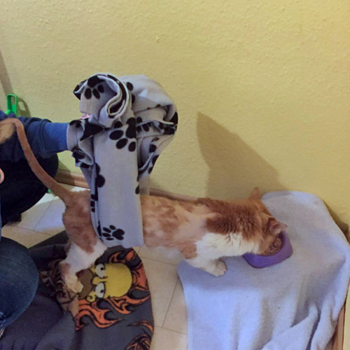 Mario ist nun seit fast zwei Wochen in Deutschland, um seinen neurologischen Gangstörungen durch umfangreiche Untersuchungen auf den Grund zu gehen. Damit die Zeit zwischen den einzelnen Untersuchungen, es steht nun eine Vorstellung bei einer auf neurologische Erkrankungen bei Katzen spezialisierten Fachärztin an, nicht unnütz verstreicht, bekommt Möhre nun täglich Physiotherapie. Eine Tierphysiotherapeutin, die das Schicksal des Katers sehr betroffen gemacht hat, hat spontan angeboten mit ihm die erforderlichen Bewegungsübungen zu trainieren und die Pflegestelle so zu schulen, das die Übungen wirklich täglich durchgeführt werden können. Ein wirklicher Lichtblick, denn Möhre arbeitet unermüdlich mit und die Arbeit der Tierphysiotherapeutin ist kostenlos. Hier ein großes DANKESCHÖN an Anita S. Mario kommt nun derzeit richtig ins Schwitzen. Nur rumliegen, fressen und putzen? Da hat Möhre aber die Rechnung ohne seine Pflegemama gemacht. Beim Fressen wird gestanden und es wird erhöht gefressen. Das alles soll und wird helfen, damit sich die Muskeln von Mario wieder ausbilden. Und es wirkt! Auch wenn das Video sehr kurz ist und der süße Mario am Ende um plumpst, zeigt es doch, dass es für Mario durchaus eine Chance gibt. Die Untersuchungen und Übungen gehen weiter und Mario sendet Ihnen verschwitzte und liebe Grüße! Bitte kämpfen Sie mit uns weiter für Mario!