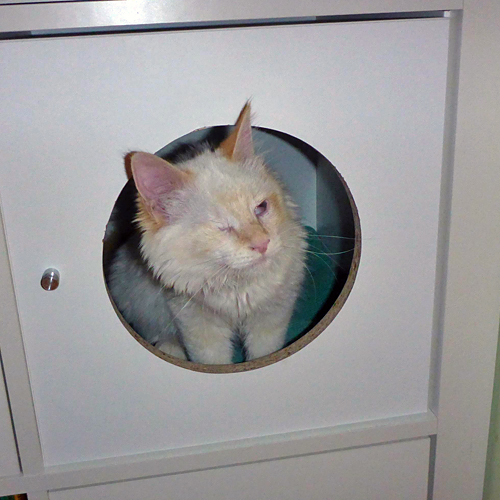 12.10.2016 - Ceci und Guercino - Das Warten im Dunkeln! Der kleine Ceci (cieco = blind) wurde im Rifugio abgegeben. Seine Augen standen weit aus den Augenhöhlen hervor und waren zu dem Zeitpunkt schon so in Mitleidenschaft gezogen, dass wir das Augenlicht von Ceci nicht mehr retten können. So ist zumindest die Diagnose des sardischen Tierarztes. Ceci wird im Moment nur mit lokaler Antibiotika behandelt und letztlich müssen wir darauf warten, dass er groß genug ist, eine Operation über sich ergehen zu lassen, um beide Augen zu entfernen. Mit ihm wartet der kleine weiße Guercino, denn auch seine Diagnose lautet, dass seine Augen unwiderruflich geschädigt sind und entfernt werden müssen. Beide Katerchen sind ansonsten topfit und sprühen nur so vor Energie. Um sich die furchtbare Langeweile im Käfig zu vertreiben, spielen sie mit allem, was sie zwischen ihre kleinen Pfötchen bekommen und werden dabei nicht müde. Die wenigen Streicheleinheiten am Tag saugen sie wie ein Schwamm in sich auf, dann werden sie ganz ruhig und leise und genießen den kurzen Moment der Fürsorge. Bei über 70 Katzen im Rifugio ist mehr leider nicht möglich. Daher suchen wir für Guercino und für Ceci, sehr gerne gemeinsam, eine Pflege- oder Endstelle. Wir würden zudem die Operationen zur Entfernung der Augen sehr gerne in Deutschland durchführen lassen und für die beiden wäre es wunderbar, sich nach der Operation gleich in ihrem Zuhause erholen zu dürfen. Die Entfernung der beiden Augen mag für manche eine Horrorvorstellung sein, wir möchten Ihnen die Angst und Skepsis nehmen. Es handelt sich vergleichsweise um einen kleinen, chirurgischen Eingriff, den die Katzen gut und schnell verarbeiten. Dieser Eingriff ist nötig, um die Entzündung der Augen zu stoppen. Der Mensch muss sich lediglich an den ungewohnten Anblick der Katzen gewöhnen, umgekehrt ist das schon geschehen. Wir müssen davon ausgehen, dass Guercino und Ceci ihre Welt noch nie gesehen haben und kommen auch wunderbar damit zurecht. Wir wünschen uns für die beiden ein Zuhause mit großer Terrasse oder Balkon, damit sie trotz ihrer Behinderung die Wärme der Sonne, die Gerüche und vieles von dem, was draußen so interessant ist, mitbekommen dürfen.