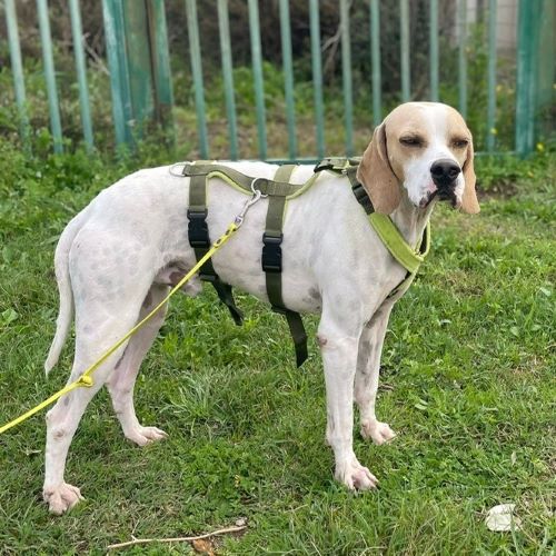 An der Leine läuft Remo mittlerweile richtig gut. Er kennt Leine und Geschirr, geht gerne spazieren und zeigt dabei seinen typischen Spürsinn - seine Nase ist viel am Boden.