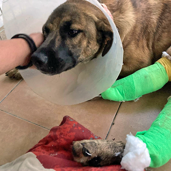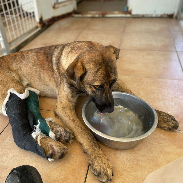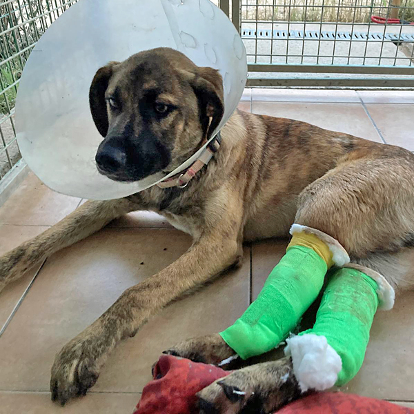 SOS: Unfallopfer Orso Der junge Rüde Orso ist Opfer eines Verkehrsunfalls geworden. Er war sich nicht darüber im Klaren, in welch gefährliche Situation er sich brachte, als er mehrfach eine vielbefahrene Straße überquerte. Leider hatte er seine Schutzengel zu oft herausgefordert und kam schlussendlich bei einem Ausweichmanöver und dadurch hervorgerufenen Crash unter die Räder. Das Ergebnis: beide Hinterbeine gebrochen und damit einhergehend unfassbar schlimme Schmerzen. Die Polizei, die bezüglich des Autounfalls hinzugezogen wurde, stellte vor Ort fest, dass der mitten auf der Fahrbahn liegende Rüde leider nicht durch einen Mikrochip gekennzeichnet war und übergab ihn letztlich in unsere Obhut. Nun gab es offiziell also keinen Besitzer und so fuhr unsere Mitarbeiterin sofort mit Orso in die nächstgelegene Klinik. Dort angekommen, zögerten die Ärzte nicht lange und operierten den jungen Rüden, denn außer den gebrochenen Beinen, war er in erstaunlich guter Verfassung, es gab keinen Hinweis für innere Verletzungen oder andere Blessuren. Die OP verlief gut und nun heißt es Ruhe halten und warten, dass die Knochen wieder zusammenwachsen. Wo Orso herkommt und warum er auf der Straße unterwegs war? Ob er schlicht auf der Suche nach Futter war oder seine Menschen wiederfinden wollte, das alles wissen wir nicht. Anhand des zugewandten, offenen Charakters vermuten wir aber, dass er mal ein Zuhause hatte und letzten Endes ausgesetzt wurde. Wir geben natürlich unser Bestes um Orso wieder vollends auf die Beine zu bekommen, aber ein Zuhause oder eine Pflegestelle, wo er gerade jetzt gezielt mit Physiotherapie behutsam aufgebaut wird, wäre natürlich viel viel besser für den jungen Rüden. Solltest du ihm ein Plätzchen bei dir zuhause anbieten können und sei es nur auf Zeit, dann melde dich gerne per Email bei uns unter Diese E-Mail Adresse ist gegen Spam Bots geschützt, Sie müssen Javascript aktivieren, damit Sie es sehen können oder Diese E-Mail Adresse ist gegen Spam Bots geschützt, Sie müssen Javascript aktivieren, damit Sie es sehen können Wenn du derzeit Platztechnisch keine Kapazitäten hast, Orso aber gerne finanziell unterstützen möchtest, dann freuen wir uns natürlich auch über jede noch so kleine Spende, um die bereits mehrere tausend Euro hohen Rechnungen stemmen zu können.