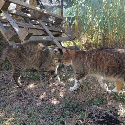 Vielleicht erinnert sich der eine oder die andere noch an ihn: Der viereinhalbjährige Valerio lebt seit langem im Park, aber im Gegensatz zu Otto war er einst ein Vermittlungskater – bis klar wurde, dass er und sein Bruder Valium einfach viel zu scheu waren, um mit Menschen zusammenzuleben. Man bekam ihn höchstens zu den Fütterungszeiten zu Gesicht, ansonsten hielt er sich eher versteckt. Doch dann geschah ein kleines Wunder: Der deutlich zugänglichere Otto nahm den ängstlichen Valerio unter seine Fittiche. Durch sein Vorbild und den Halt, den er Valerio gab und gibt, gewann Valerio an Selbstsicherheit und Zutrauen – und mittlerweile sind die beiden einfach unzertrennlich...