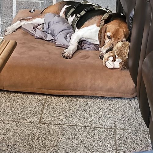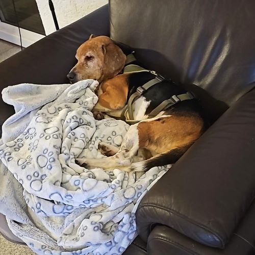 Gustav wäre gerne immer und überall dabei, er bleibt zwar mit den anderen Hunden auch schon mal kurzzeitig alleine im Zimmer, aber er hat ein sehr großes Bedürfnis auf menschliche Nähe – wie kann man es ihm verdenken. Dass in Gustav eine gehörige Portion Beagle drinsteckt, zeigt sich spätestens in seiner Leidenschaft gegenüber essbaren Dingen. Und so sollte man Essbares immer gut wegräumen, damit es nicht von Gustav’s Nase aufgespürt wird und ungehindert den Weg in seinen Bauch findet. Gerade in der Vorweihnachtszeit durchaus eine Herausforderung. Gustav liegt gerne mit auf der Couch und genießt die Kuscheleinheiten am Abend ganz besonders. Bei Aufregung, zum Beispiel, wenn das Pflegefrauchen kurz weg war oder sich ein Spaziergang „anbahnt“, bellt Gustav schon gerne mal, beruhigt sich dann aber auch schnell wieder.