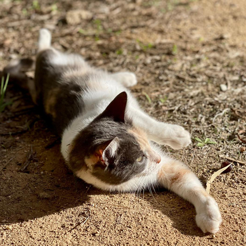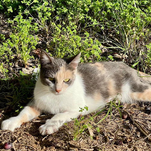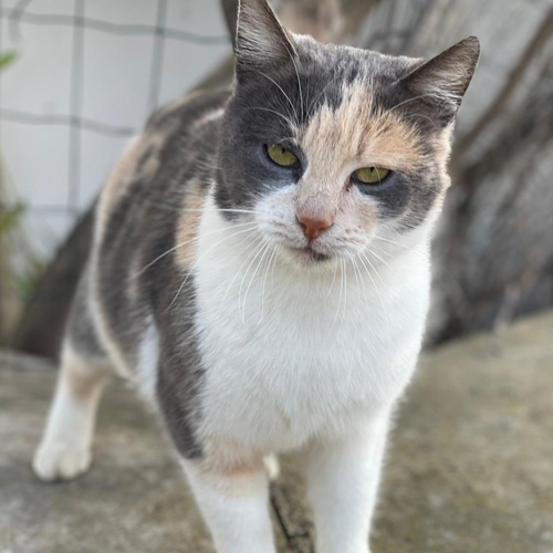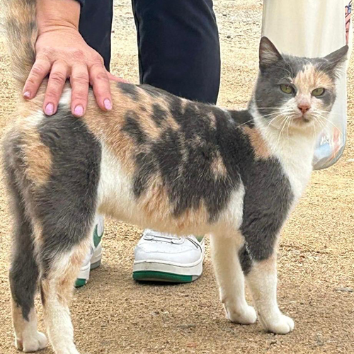 Die wunderschöne dreifarbige Mia fiel uns im Zuge einer Kastrationsaktion auf. Touristen machten uns darauf aufmerksam, dass sich auf einem Campingplatz in Tortolì etliche Katzen mit ihren Jungen befanden - und wir schritten sofort zur Tat, um weiteres Tierelend zu verhindern. Da die Katzen von den Campingplatzbetreibern gefüttert werden, war der Plan, alle kastrierten Katzen wieder dort anzusiedeln; aber Mia ist derart menschenbezogen, dass alle der Ansicht sind, sie wäre in einem echten Zuhause besser aufgehoben...